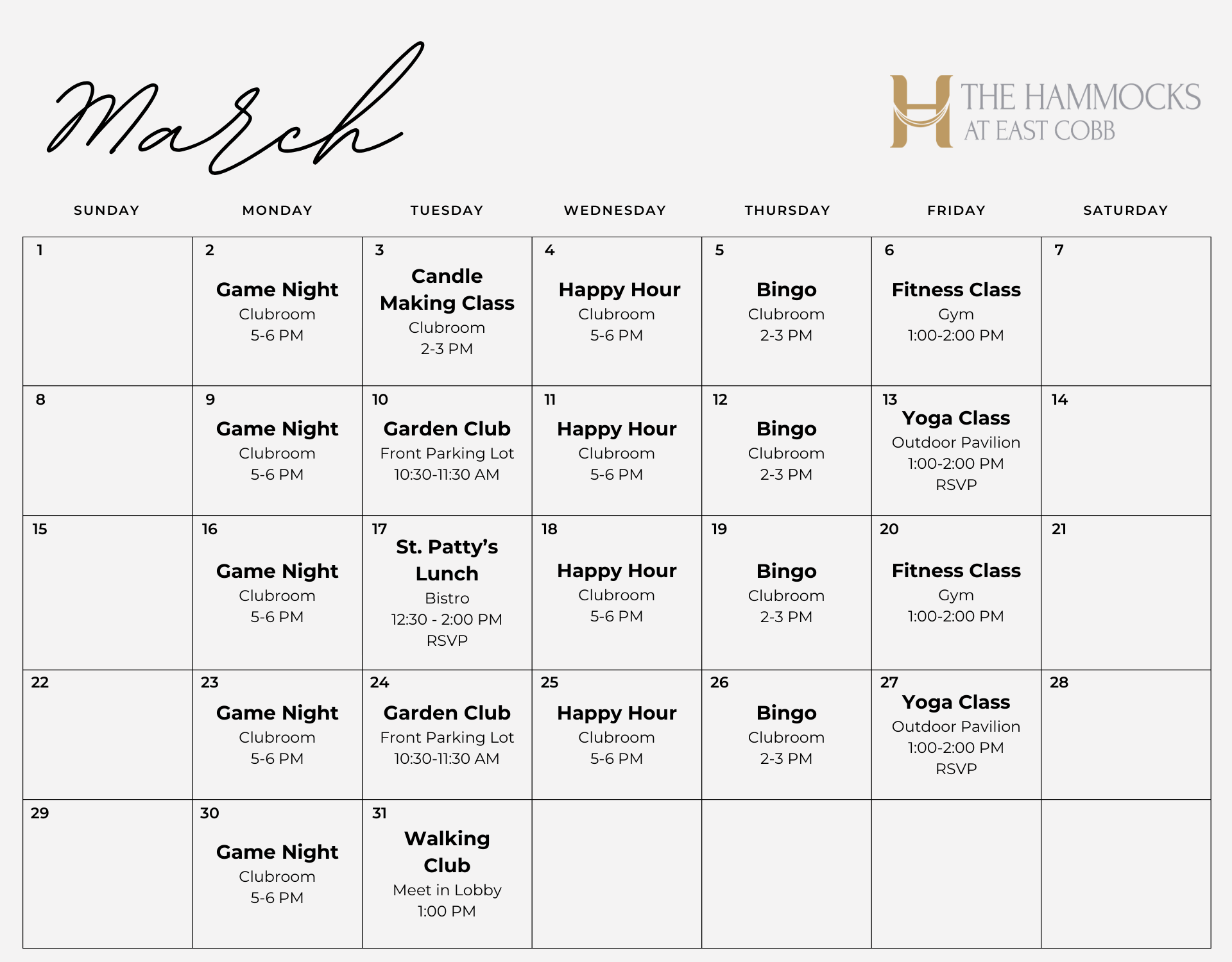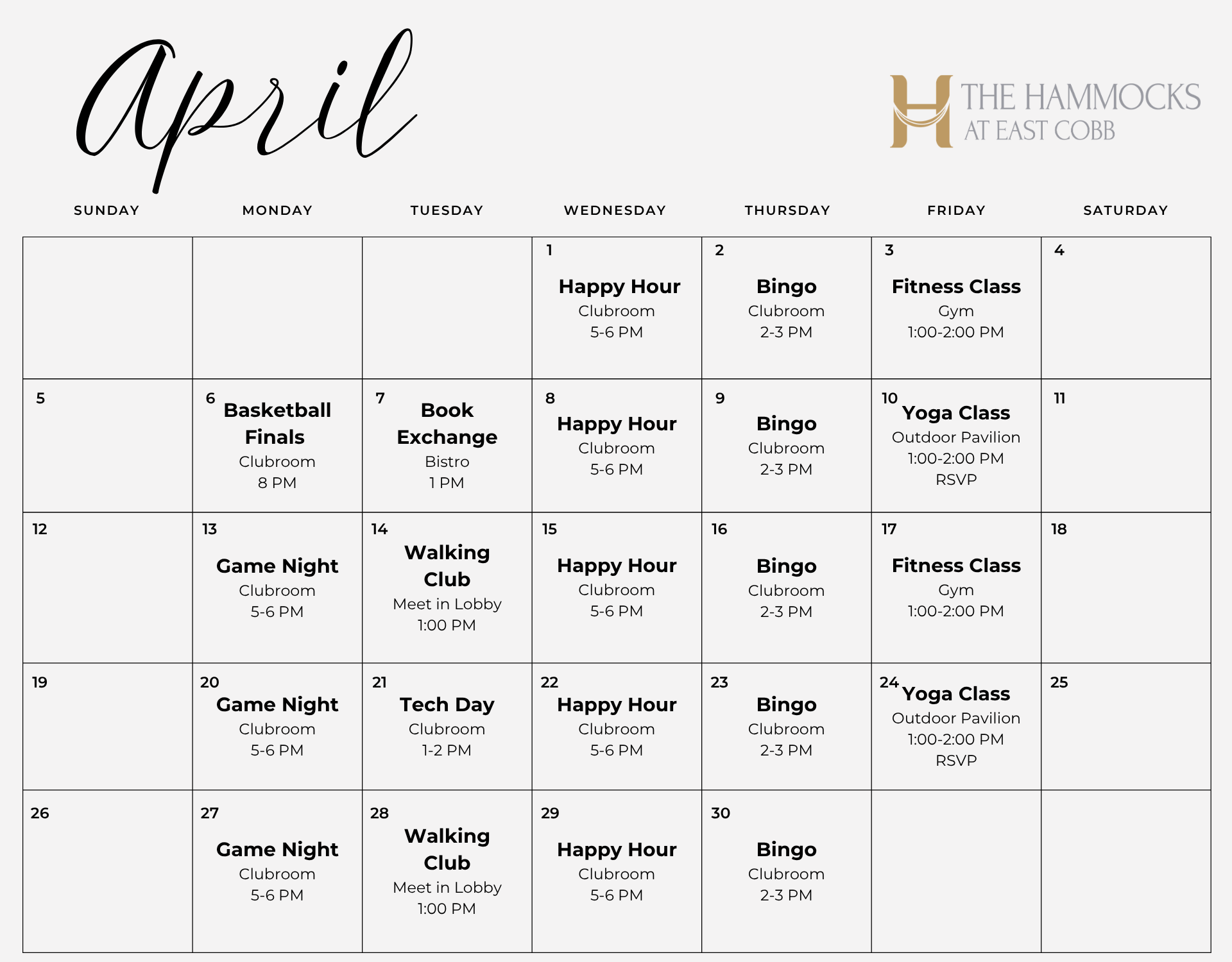 You’re invited to be part of the vibrant lifestyle at The Hammocks at East Cobb. Each month, we host thoughtfully planned events that bring neighbors together and create meaningful moments. Whether you already call our community home or are considering it for the future, we welcome you and those closest to you to join us.